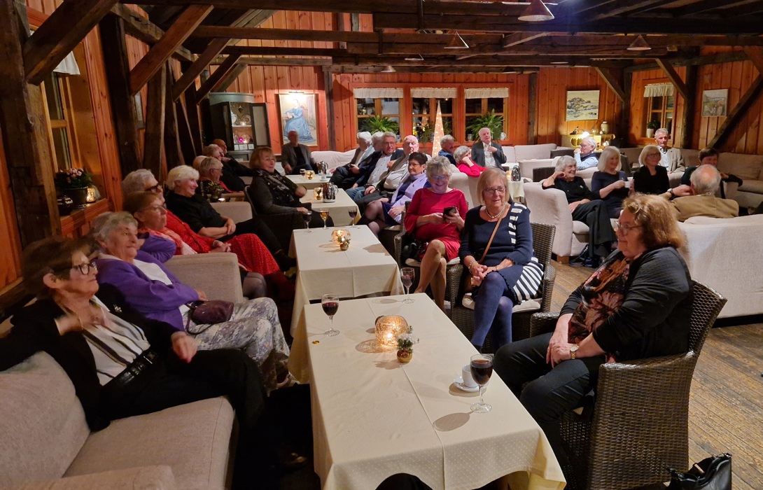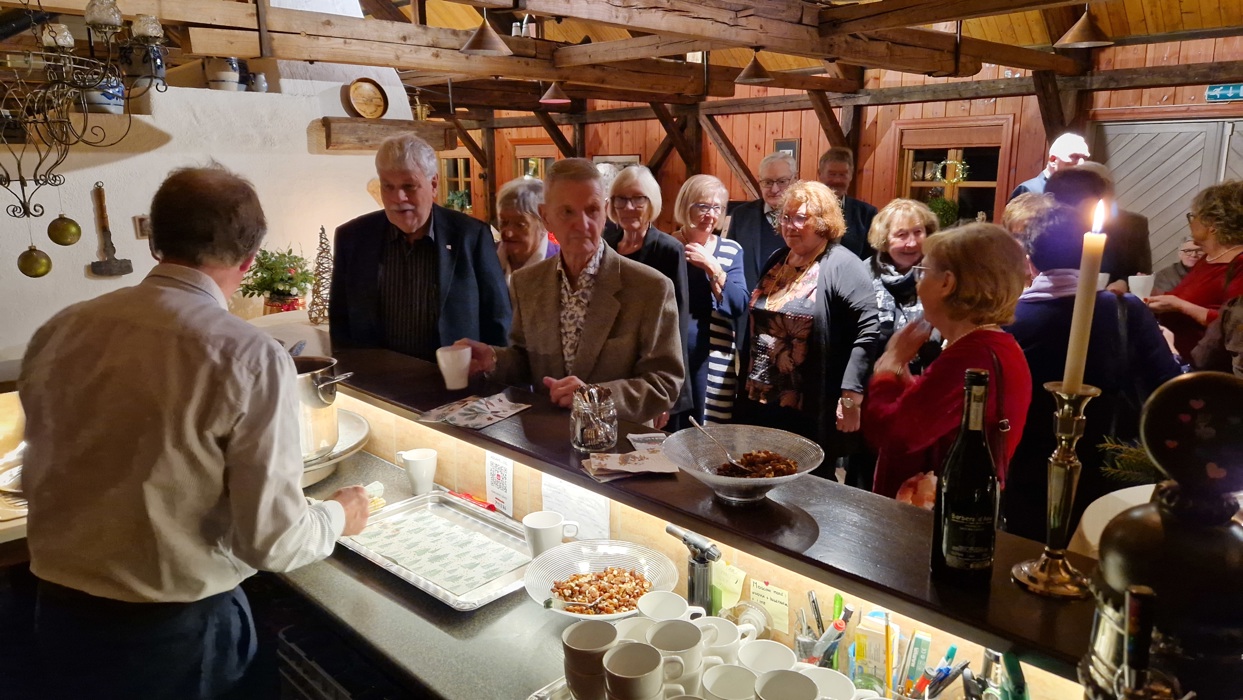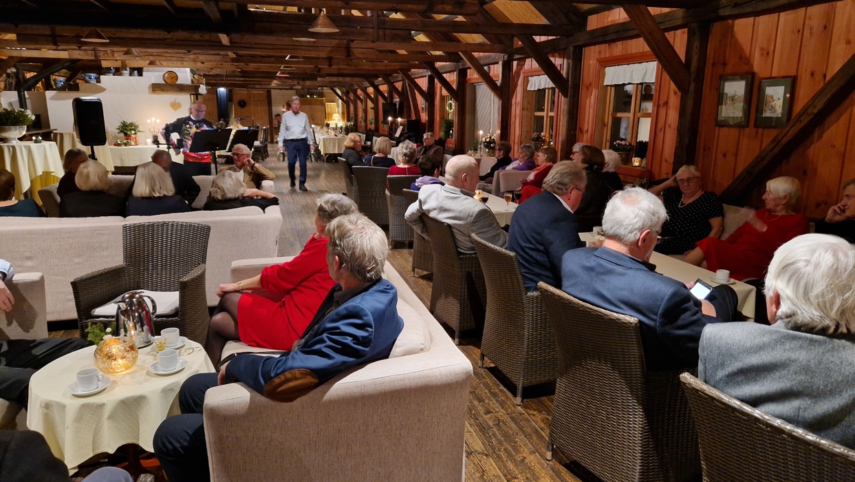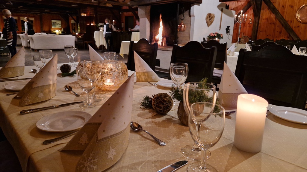selvfølgelig inne med fyr på peisen og nydelig dekkede bord til oss 34 telepensjonister!